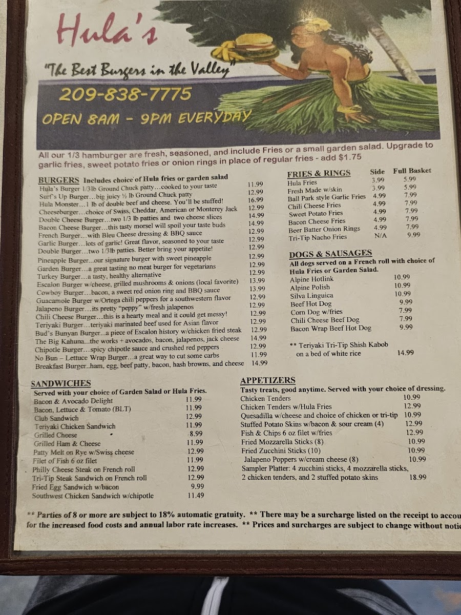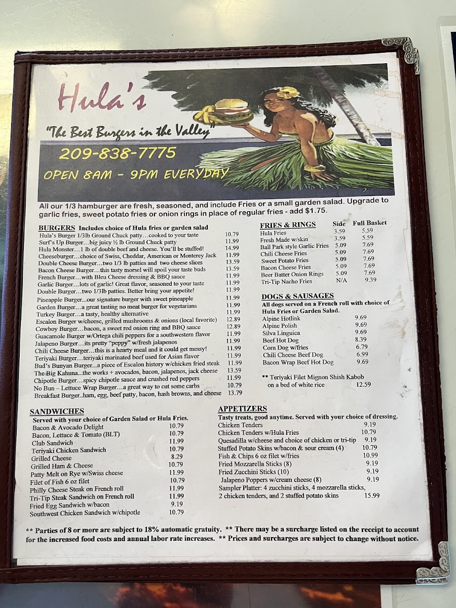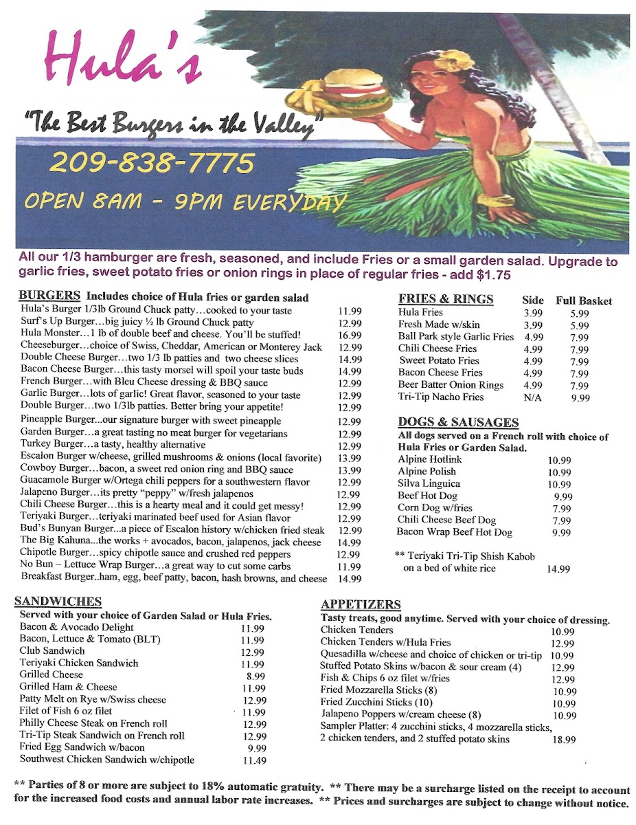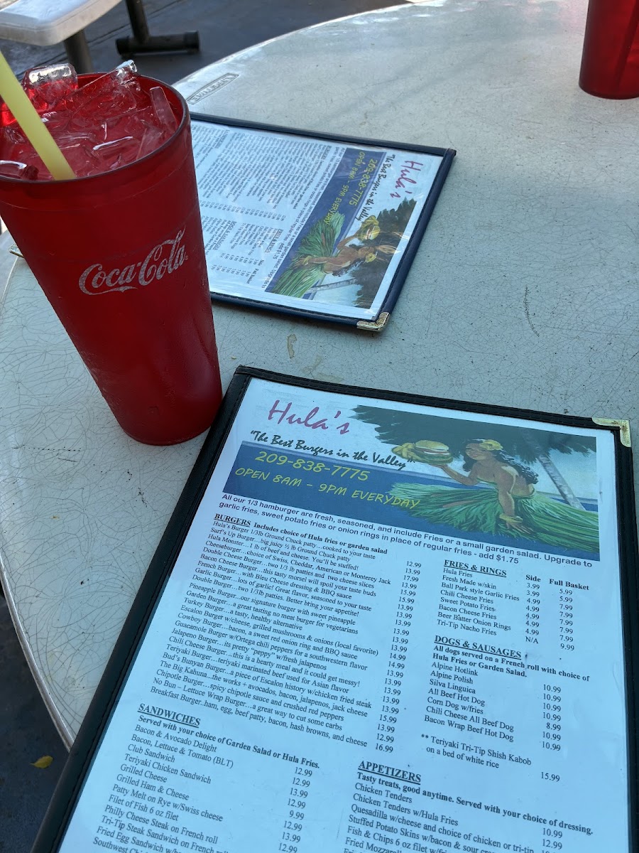 Welcome to Hula's, a lively hamburger haven located at 2261 Jackson Ave #2050 in Escalon, CA. Renowned for its mouthwatering burgers and inviting atmosphere, Hula's marries fun with flavor. Dive into a selection of fresh ingredients crafted into delicious patties, like the standout Hula Monster, layered with jalapeños, avocados, and a mix of cheeses. Guests rave about the crispy seasoned fries and truly indulgent milkshakes, with flavors including chocolate, peanut butter, and Oreo being fan favorites.